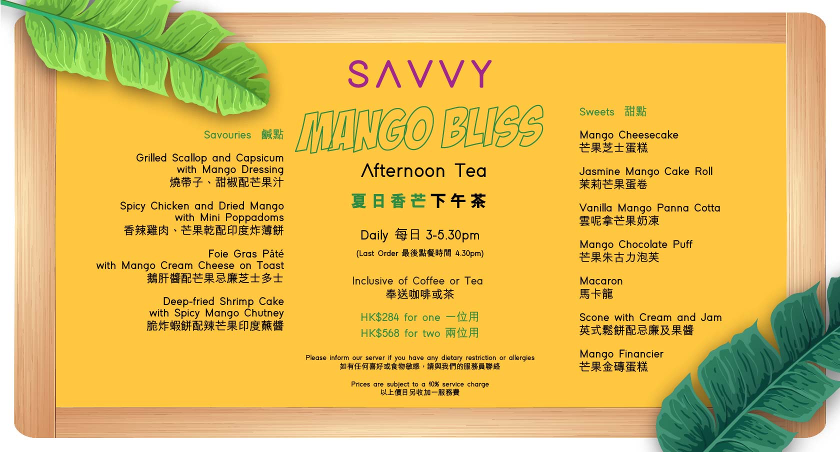 SAVVY’s mango-themed afternoon tea, available through July, features an array of mango desserts and savory bites. Highlights include mango cheesecake, panna cotta, and innovative pairings like foie gras with mango cream cheese.